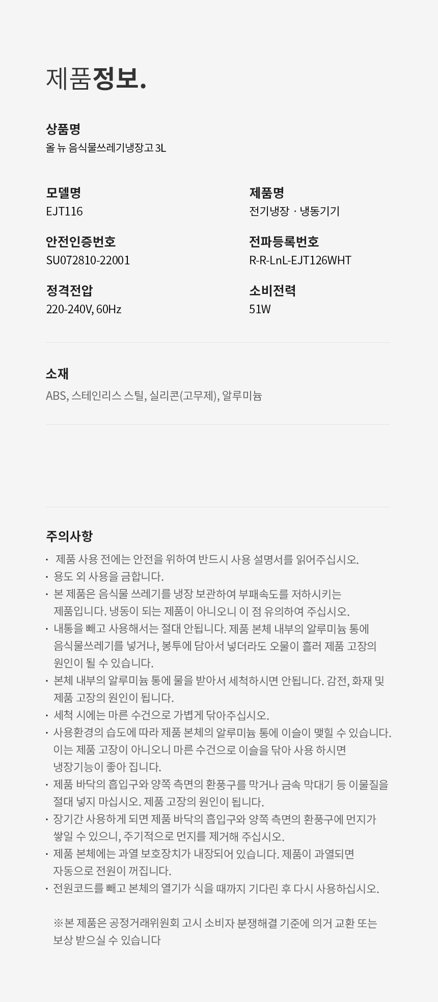 [¶ô¾Ø¶ô] À½½Ä¹° ¾²·¹±â ³ÃÀå°í 3L (EJT216)