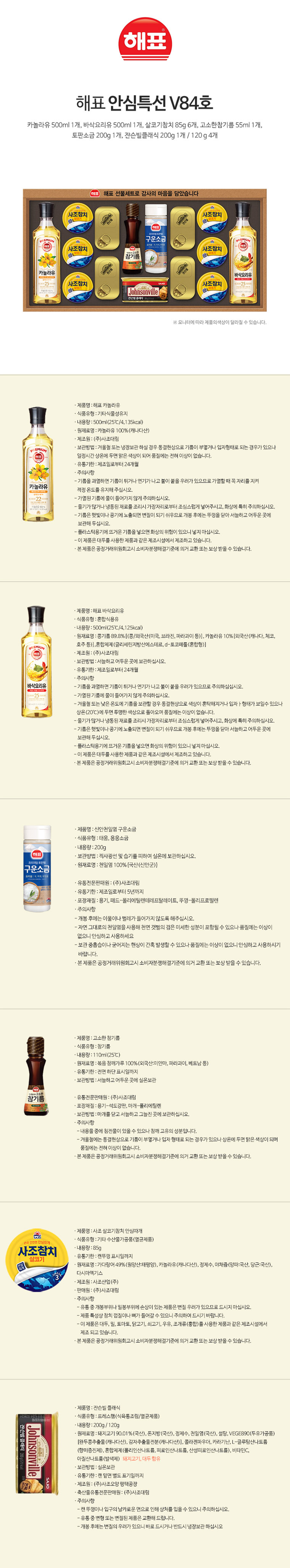Ä«³î¶óÀ¯500ml 1°³, »ìÄÚ±âÂüÄ¡85g 6°³, Àò½¼ºôŬ·¡½Ä120g 4°³, Àò½¼ºôŬ·¡½Ä200g 1°³, °í¼ÒÇÑÂü±â¸§110ml 1°³, ÅäÆÇ¼Ò±Ý200g 1°³, ¹Ù»è¿ä¸®À¯500ml 1°³